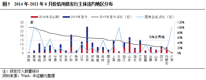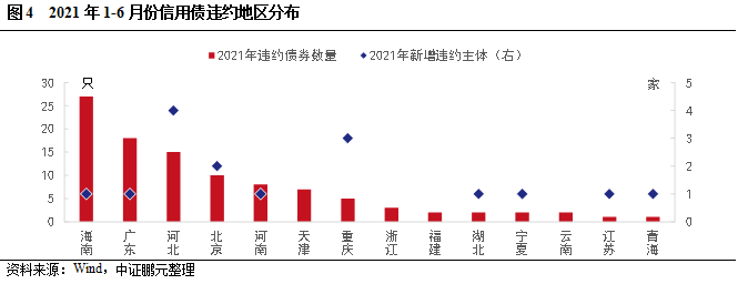 從違約債券分布地區看,2021年上半年違約債券主要分布在海南、廣東、河北,新增違約主體主要分布在河北、重慶和北京。從各省累計違約情況看,2018年及之前違約的部分省份,在2019年后違約逐漸減少,例如,廣西、內蒙古、山西、湖北和黑龍江;而存續債券規模較大的浙江、江蘇、安徽和山東,近兩年違約占比較高;此外,部分欠發達地區近年出現違約,例如,青海、甘肅、寧夏、云南,違約數量不多,但個別風險的暴露已影響區域再融資環境。結合企業性質看,青海、云南、廣西違約國企占比最高,其次,海南、天津、吉林、遼寧的國企占比在50%左右。