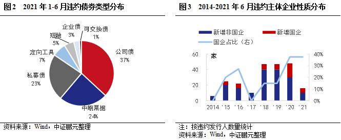 上半年違約特征:從違約類型看,新增違約債券中,2只為技術性違約,9只首次違約是因觸發交叉保護條款,其余92只均為實質性違約。從違約事件看,53只為本金利息項違約,6只涉及回售款項違約,31只因破產觸發其他到期,9只觸發交叉保護條款,4只債券加速清償到期。從債券類型看,公司債38只、中期票據25只,私募債24只,三個券種合計占比84.5%,其余債券類型占比較小。從企業性質看,16家新增違約主體中5家為地方國有企業,1家為中央國有企業,其余10家均為民營企業,國有企業數量占比37.5%,與上年持平。從上市情況看,16家新增違約主體中2家為上市公司,其余均為非上市公司。從處置方式看,24只債券發行人與持有人達成展期兌付協議,43只債券因發行人進入破產重整程序而提前到期,其他債券均未公布兌付方案。從違約債券分布地區看,2021年違約債券主要分布在海南、廣東、河北,新增違約主體主要分布在河北、重慶和北京。