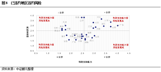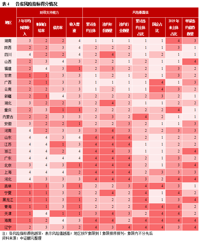 整體看,區域違約風險,涉及因素較多,本文通過關鍵指標的定量分析,對區域風險進行劃分。需要注意的是,由于指標有限性,區域劃分并非絕對,在具體分析時,需考慮相關調整因素。