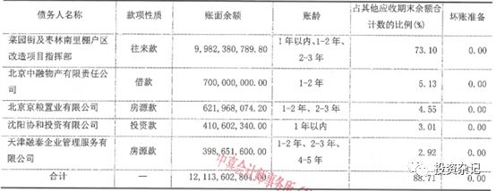 乍一看好像沒有什么問題,第一大也是最主要的欠款方式政府,主要是棚改方面的款項;第三大欠款方京糧置業是首農集團下面的全資公司,這個也沒啥問題;其余三個如果細心用天眼查等軟件一查詢,就會發現問題:其中,北京中融物產有限責任公司是天津融泰企業管理服務有限公司的全資子公司(也就是第五大欠款方),進一步查詢天津融泰的股權,則會發現其實該發行人與北京國安控股有限公司的合營公司,雙方各持股50%,而北京國安控股有限公司向上穿透則會發現其是中信國安集團有限公司的全資孫公司,而中信國安已經發生了債務違約。目前涉及到中信國安的這兩筆其他應收款合計近11億,且賬齡較長,在存在較大回收風險的情況下都未計提壞賬準備,至少在目前看來是存在問題的;第四大欠款方沈陽協和投資有限公司則是自然人郭淑琴(持股60%)和郭文颙(持股40%),該筆款項性質是投資款,可能是公司與其之間存在股權轉讓之類的事項,但對方還沒有付款,因為對方是自然人控制的民企,實際回款情況也需要進一步核實,是否存在壞賬風險。