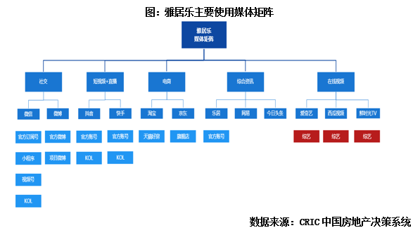 從CRIC監(jiān)測(cè)情況來(lái)看,目前雅居樂(lè)的媒體矩陣中,橫向矩陣基本覆蓋了各年齡段經(jīng)常使用的平臺(tái),在社交、短視頻、直播、綜合資訊等平臺(tái)均有布局,由于雅居樂(lè)跨界綜藝的創(chuàng)新?tīng)I(yíng)銷方式,因此媒體矩陣中還包括鮮有房企進(jìn)駐的在線視頻平臺(tái),這也是雅居樂(lè)媒體矩陣的特色之一;縱向矩陣中微信布局較為全面,處于行業(yè)內(nèi)中等偏上水平。
