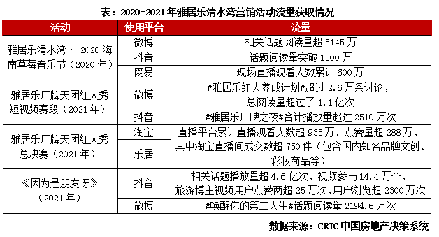 2020年初,雅居樂(lè)計(jì)劃舉辦第八屆國(guó)際沙灘啤酒狂歡節(jié),原希望以“國(guó)潮+英倫+啤酒”的形式讓業(yè)主感受不一樣的新年氛圍,后期由于疫情未能舉辦,但雅居樂(lè)的造勢(shì)積極性并未受到打擊。同年11月,超6萬(wàn)名樂(lè)迷齊聚清水灣,雅居樂(lè)清水灣·2020海南草莓音樂(lè)節(jié)開(kāi)啟全網(wǎng)超2億次的平臺(tái)傳播浪潮。2021年雅居樂(lè)乘勝追擊,通過(guò)雅居樂(lè)廠牌天團(tuán)紅人秀選出“清水灣隊(duì)”,進(jìn)入“樂(lè)居廠牌之夜終極大秀”,海南清水灣品牌獲得持續(xù)推廣。廠牌天團(tuán)紅人秀是“地產(chǎn)圈+娛樂(lè)圈+直播圈”的勇敢嘗試。2021年12月,雅居樂(lè)聯(lián)合英皇娛樂(lè)制作房產(chǎn)行業(yè)內(nèi)首個(gè)綜藝跨界的節(jié)目——《因?yàn)槭桥笥蜒健罚ㄟ^(guò)與眾多平臺(tái)深度內(nèi)容合作,持續(xù)推廣清水灣項(xiàng)目,同時(shí)開(kāi)通抖音小店和“沉浸式”直播,推出明星同款海島游和購(gòu)房折扣券,實(shí)現(xiàn)邊看邊買的線上線下聯(lián)動(dòng)的營(yíng)銷閉環(huán)。
