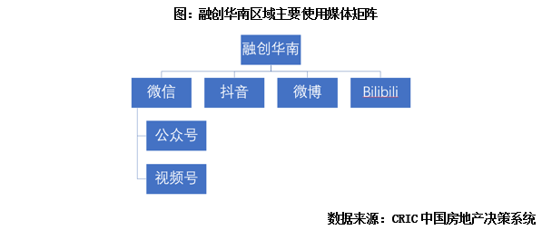 融創(chuàng)華南區(qū)域來(lái)看,基于數(shù)字化營(yíng)銷數(shù)據(jù)沉淀,融創(chuàng)華南區(qū)域積極構(gòu)建新媒體矩陣,對(duì)抖音、微信等產(chǎn)品進(jìn)行數(shù)據(jù)打通,線上營(yíng)銷形成閉環(huán)。首先是搭建媒體矩陣:融創(chuàng)華南區(qū)域利用三大新媒體平臺(tái)實(shí)現(xiàn)四條流量入口,即微信公眾號(hào)、微信視頻號(hào)、抖音和微博,另外融創(chuàng)華南也開(kāi)設(shè)B站,面向年輕人主打微綜藝。