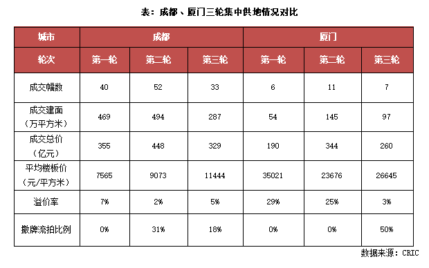 12月9日,成都和廈門第三輪土拍也正式收官。和此前開拍的多數城市一樣,成都也大幅降低了土地出讓門檻,多舉措增加項目利潤空間,吸引房企拿地。而廈門則較為特殊,是三輪中少有的幾個升級出讓規則的城市。