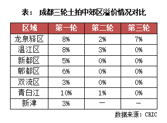 而結合前兩輪土拍來看,郊區的地市在第二輪就明顯遇冷,僅龍泉驛、溫江和青白江三個區域有溢價,且溢價率降至5%以下;三輪中更是僅有龍泉驛一個片區有溢價,其余區域的地塊均為底價出讓。