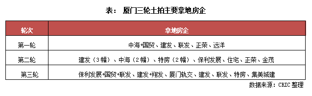 第三輪地塊基本均由本土國企托底,建發成為廈門三輪土拍最大贏家