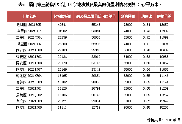 事實上,雖然廈門開啟了全面限房價,但第三輪土拍出讓地塊的利潤空間并不低。據粗略測算,14宗地即使全部達到最高限價,其平均地房比也在0.7以下,房地價差也均超過了1萬元/平方米,如湖里P06地塊的價差甚至高達2萬元/平方米以上,仍給房企預留了一定的利潤空間。
