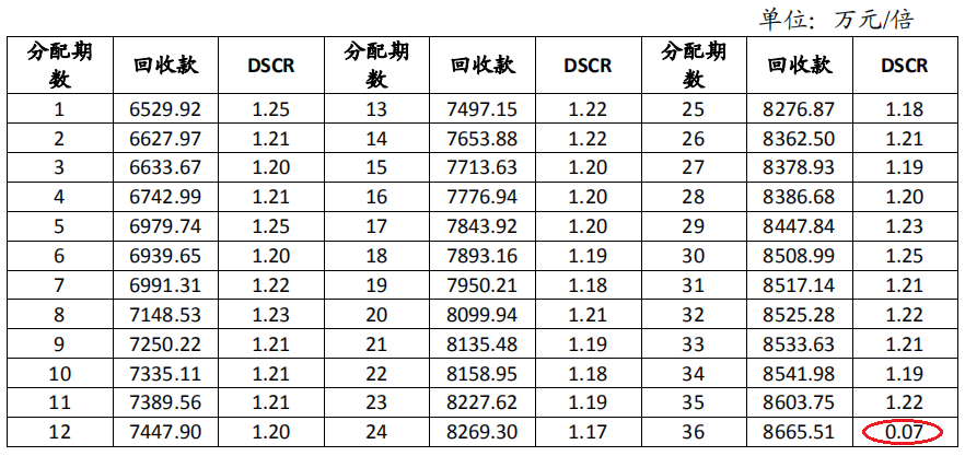 以“北京城市副中心投資建設(shè)集團(tuán)有限公司2019年度第一期資產(chǎn)支持票據(jù)”為例,最后一期回收款對優(yōu)先級證券的應(yīng)付本息覆蓋倍數(shù)僅有0.07倍,可以推測,最后一期的優(yōu)先級證券本金明顯較大。聯(lián)合評級披露,本交易優(yōu)先級票據(jù)的到期本息償付將依賴于發(fā)起機(jī)構(gòu)的再融資能力或抵押物處置變現(xiàn)價(jià)值,故聯(lián)合資信對于本交易 DSCR 測算不考慮最后年份。