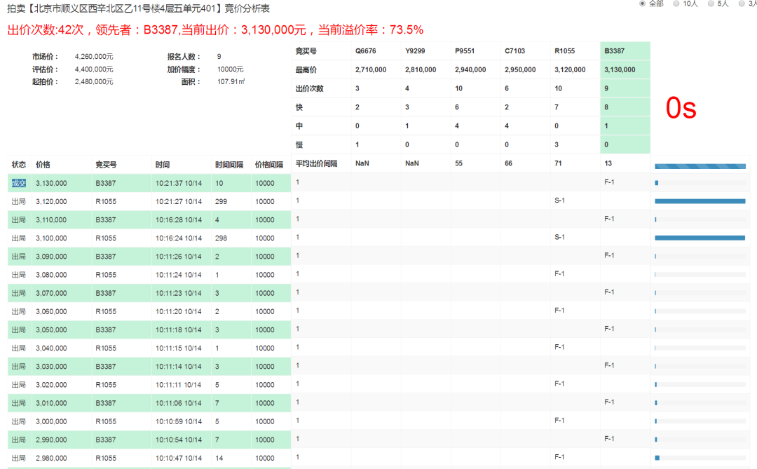 2020年10月14日客戶參拍了位于順義區西辛北區的一套房產,參拍過程中競爭非常激烈,這套房產一共9人報名,6人出價。在經過42次出價后,最終以313萬元價格成功競得順義西辛北區這套房源。市場上法拍房成交價一般在二手房市場價的85折左右,而這套房源的最終成交價僅為市場價的7.3折,客戶表示非常滿意。