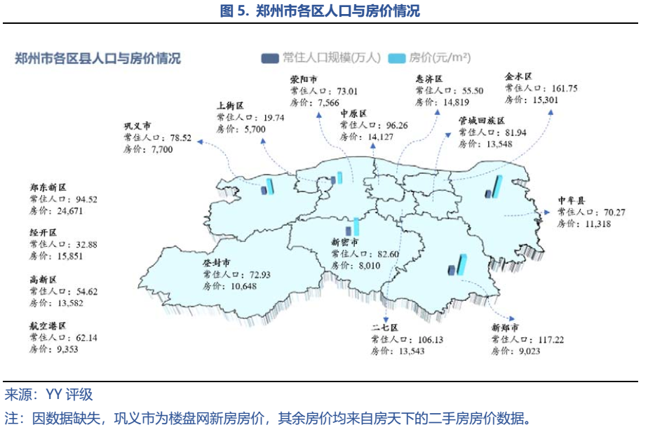 雖然鄭州人口保持高增長,但近年來的土地供應量也不小。鄭州當前全市房價均價為15,361元/平,城區房價明顯高于郊縣。開發熱點——鄭東新區房價水平最高,達到24,671元/平;其次是經開區和金水區,均價也突破了1.5萬元/平;惠濟區、中原區、高新區、管城區和二七區緊隨其后。而在發債區縣中,僅中牟縣房價破萬,新鄭、新密和鞏義則在8,000-9,000梯隊,上街區僅5,700元/平。