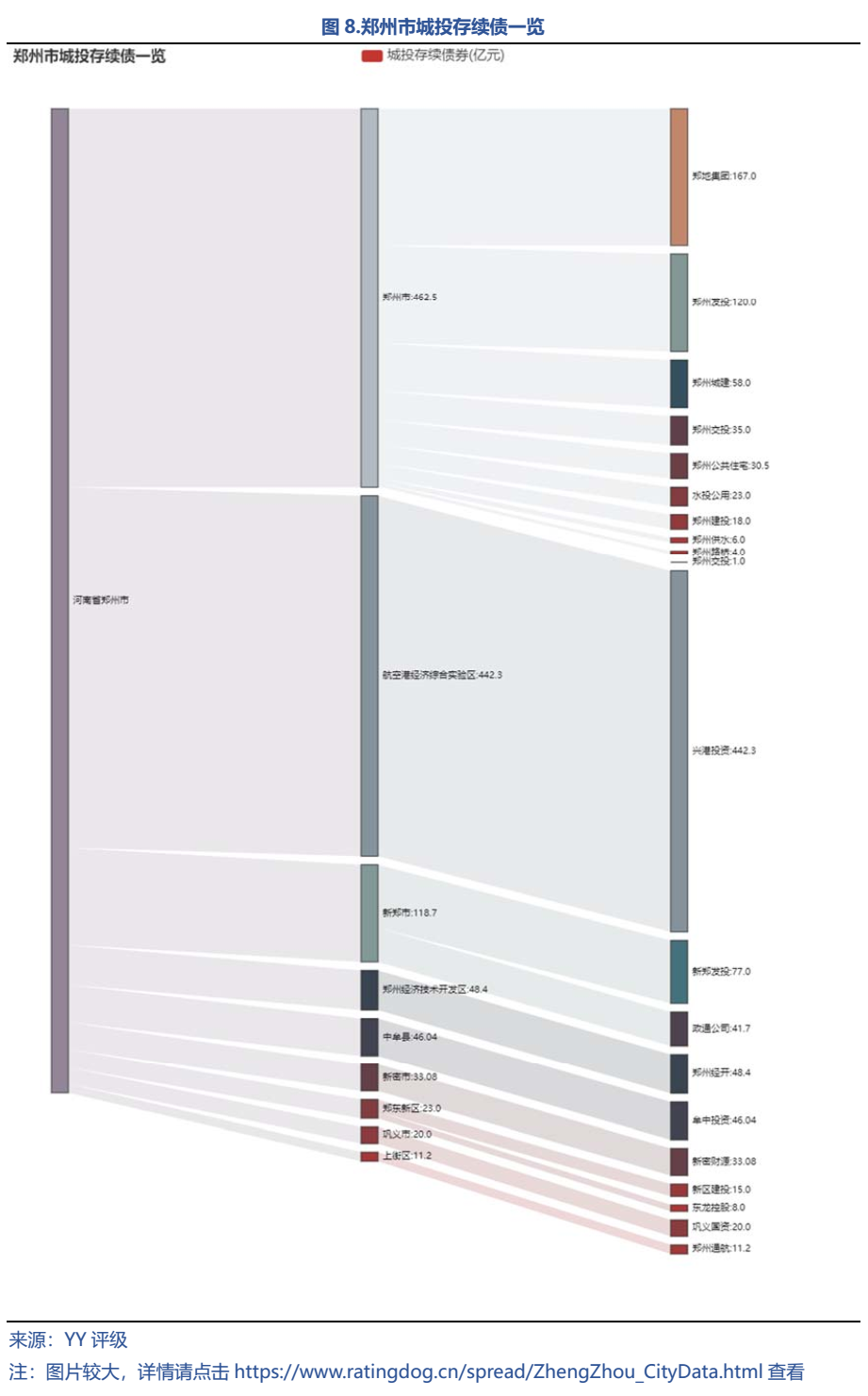 鄭州的財政實力整體較強,拉低了債務率水平,城投債務集中在市級、功能區與郊縣平臺,其中航空港區債務規模最大。
