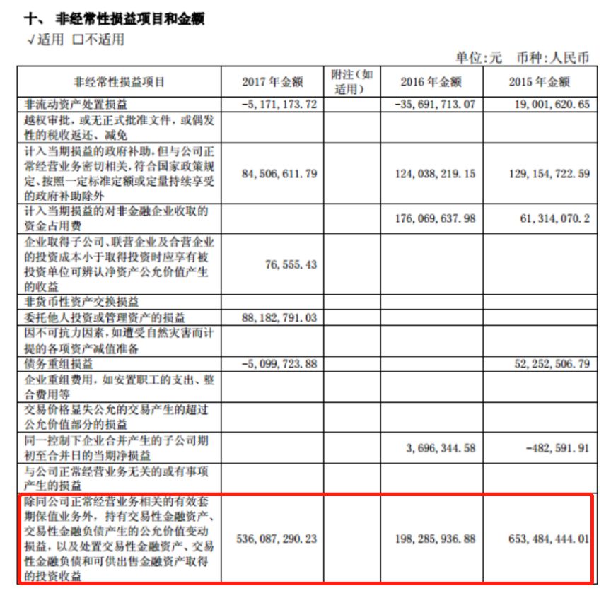 2015-2017年,公司非經(jīng)常性損益合計約25.63億元,占到同期歸母凈利潤的35.67%(追溯調(diào)整后)。