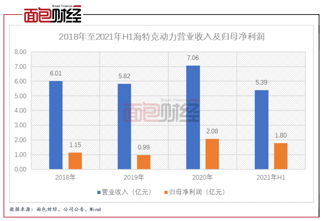2019年和2020年,海特克動力實現營業收入分別為5.82億元、7.06億元,同比分別增長-3.14%、21.19%;實現歸母凈利潤分別為0.99億元、2.08億元,同比分別增長-13.84%、109.61%。2021上半年,公司實現營業收入5.39億元、歸母凈利潤1.8億元。