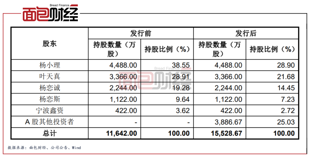 此外,截至公司招股說明書申報稿簽署日,公司的控股股東、實際控制人為楊小理、葉天真、楊戀誠及楊戀斯。楊小理與葉天真為夫妻關系,楊戀斯、楊戀誠為上述二人的子女,四人共直接持有公司96.38%的股份,其中葉天真又通過員工持股平臺寧波鑫資間接持有公司2.37%股份。其四人通過直接和間接持有公司股份比例達98.77%,股權高度集中。