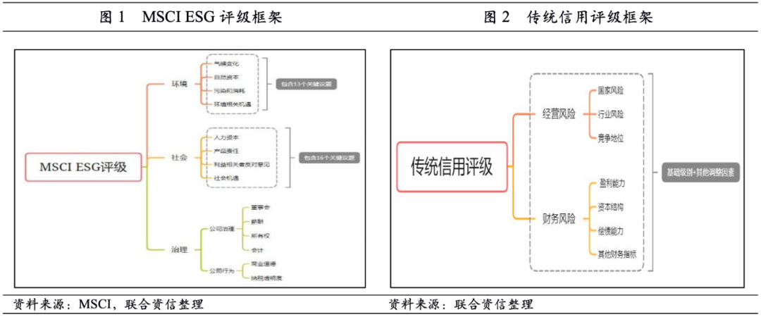 ESG是環境(Environmental)、社會(Social)和治理(Governance)的英文簡稱,而ESG評級即是針對企業在環境、社會和公司治理三個方面進行評分考核,從長遠角度判斷企業是否具備可持續發展的價值。ESG評級主要由市場中專注于提供ESG評級的第三方企業披露,比如MSCI等機構。企業信用評級簡單來說就是對企業信用風險的評估,考察發債企業的償債能力和償債意愿,主要由傳統信用評級機構披露。從概念上來看,ESG評級和信用評級評估的側重方向不同。我們選取了MSCI公開披露的ESG評級方法和傳統信用評級方法作為對比,以觀察兩種評級體系在評級方法、技術模型和指標選取等方面存在的本質上的區別。