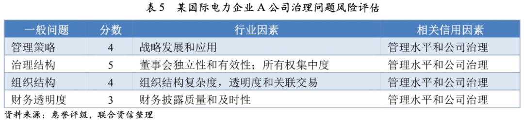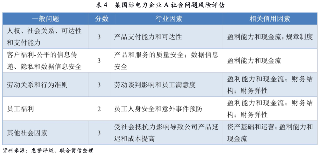 惠譽評級結合環境、社會和公司治理三大方面對某國際電力企業A進行風險評估,綜合匯總了ESG對企業A信用評級驅動因素并通過各個驅動因素數量得出ESG信用綜合評分。該ESG信用綜合評分表明ESG風險對企業A信用水平有很大影響,其中公司治理問題和信用評級關聯度最大,未來需重點關注。