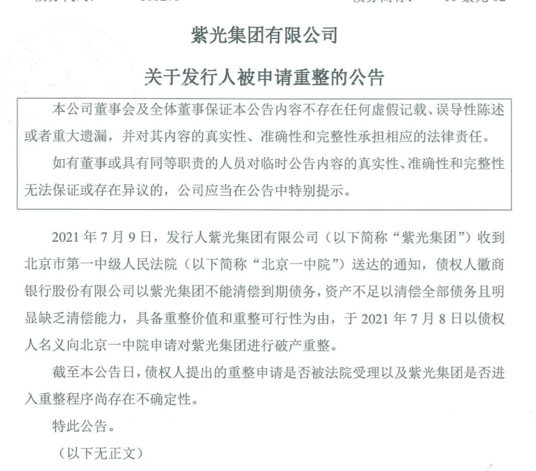 1、紫光集團公告,被債權人徽商銀行申請破產重整。經過違約之前的掙扎(各地政府都忽悠了一遍),違約后的自救(傳移動、阿里之類要重組他),都以失敗告終,看來只能清算了。這段時間紫光的成交價30+,不知道破產清算的回收率如何,看著夠嗆。