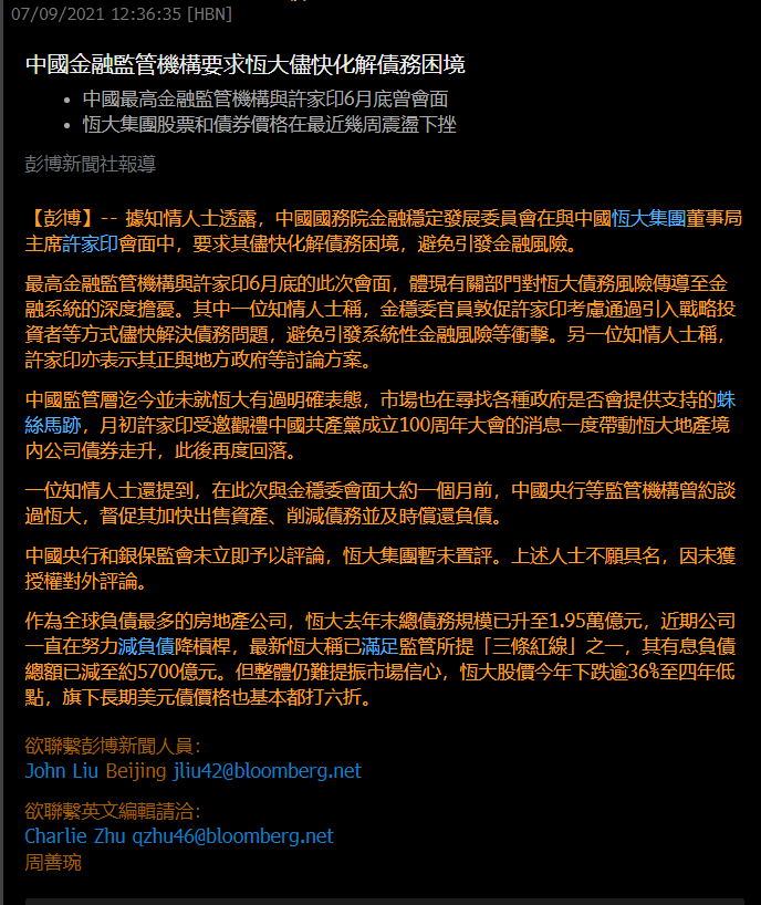 2、彭博報導金融監管機構要求恒大盡快化解債務困境。金穩委官員敦促許家印引入戰投等方式化解債務問題。昨天就傳中化下面的金茂和恒大有談,但是恒大辟謠了。