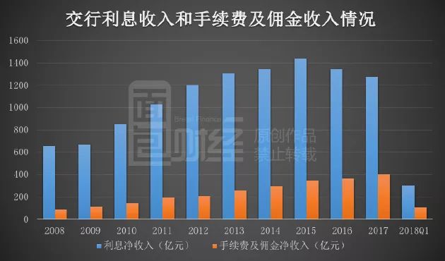 2018年一季度,交行的手續費及傭金凈收入為108.44億元,同比減少3.86%,出現上市以來較為罕見的下降。