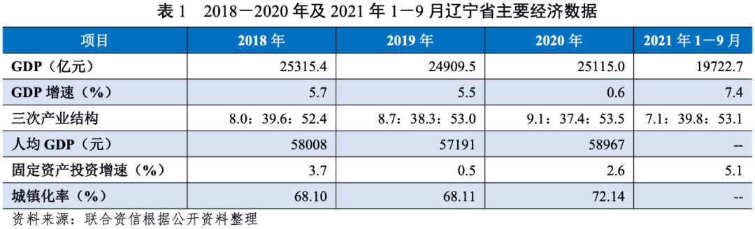 遼寧省地處中國東北邊境,是東北地區唯一既沿海又沿邊的省份。遼寧省是中國重要的老工業基地之一,石化、冶金和機械產業為遼寧省支柱產業;2020年遼寧省經濟總量仍位于全國中游水平,人均GDP處于全國中下游水平。2020年,遼寧省一般公共預算收入全國排名第13位,一般公共預算收入穩定性較強,但是財政自給率一般。2018-2020年,遼寧省政府性基金收入快速增長,上級補助收入對地方綜合財力貢獻程度較大。2020年,遼寧省政府負債率為36.86%,政府債務率為128.45%,遼寧省政府負債水平較高,債務負擔較重。2021年前三季度,遼寧省經濟增速及固定資產投資同比增速均大幅提高;遼寧省一般公共預算收入和稅收收入同比增速亦均大幅提高。