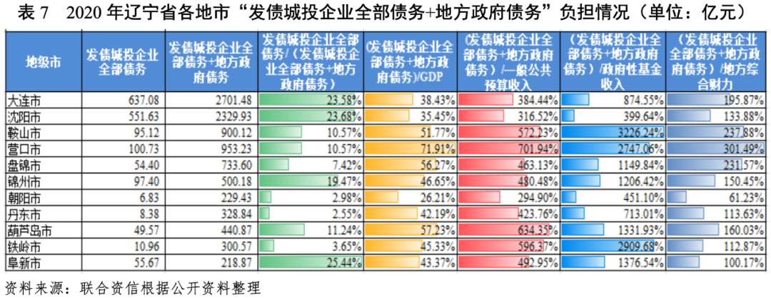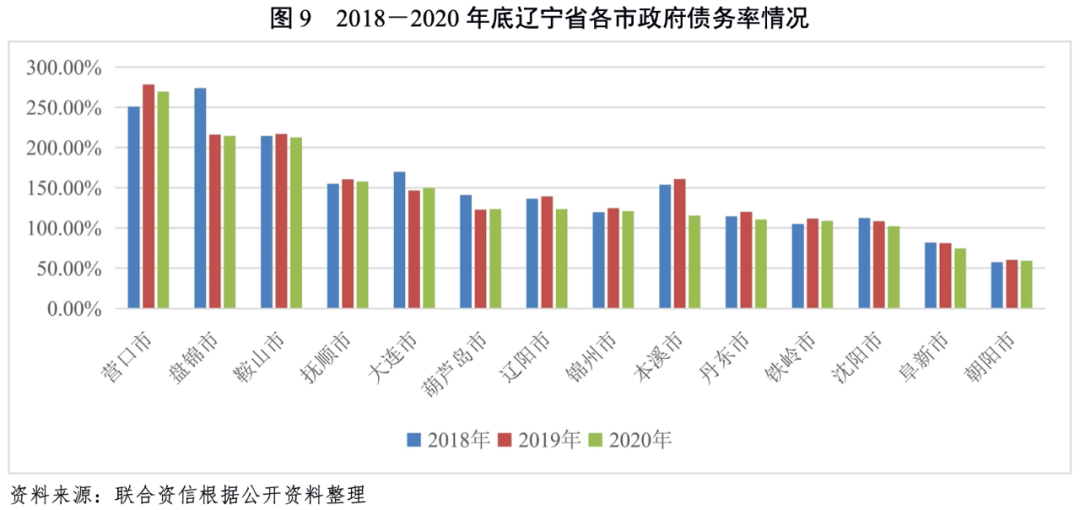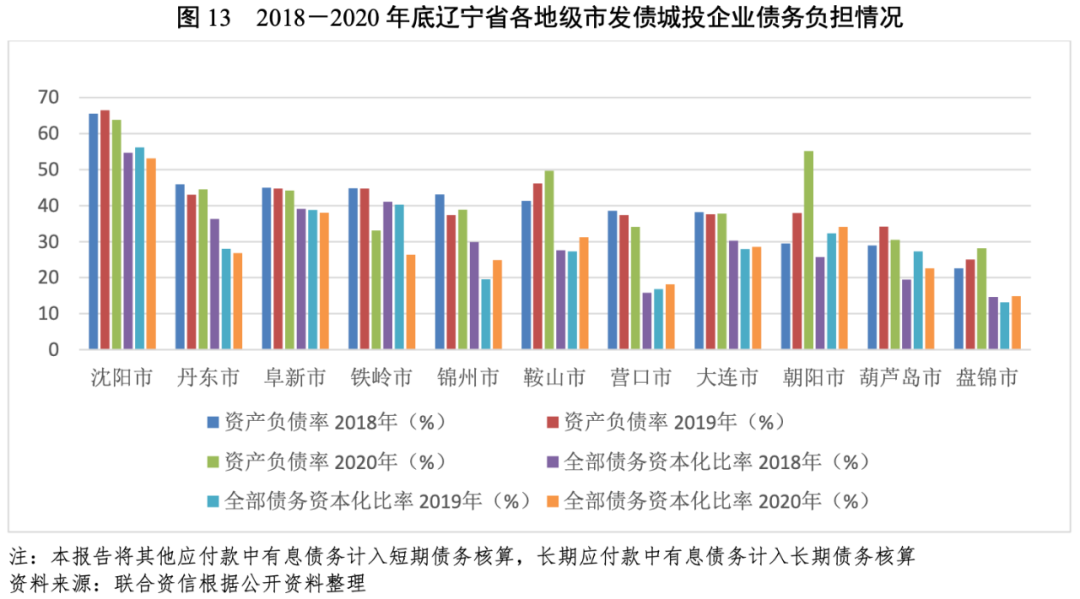 從各地區債務負擔來看,“發債城投企業全部債務+地方政府債務”/GDP較高的地級市分別為營口市、葫蘆島市、盤錦市和鞍山市,截至2020年底,上述地區該比值均超過50%;其他地市該比值在30%~50%之間。