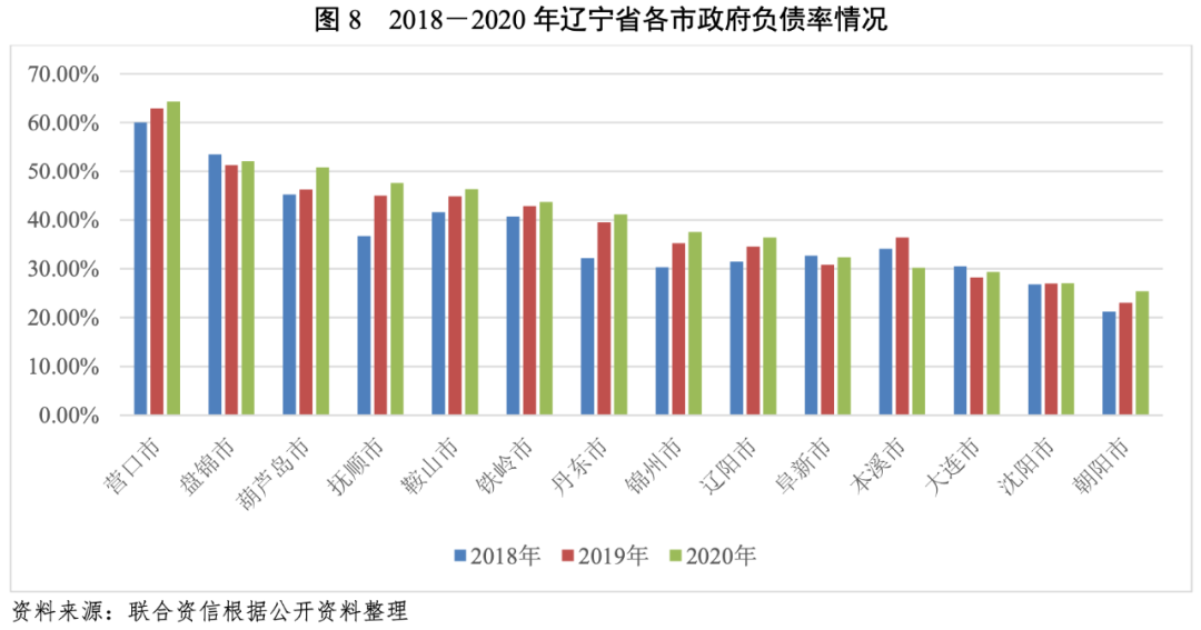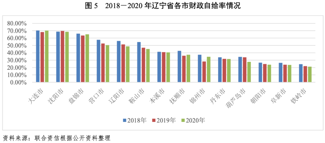 與經濟實力相匹配,遼寧省各市一般公共預算收入亦分化明顯,其中沈陽市和大連市一般公共預算收入較高且穩定性較強。2018-2020年,遼寧省內各市一般公共預算收入質量整體變化不大;各市財政自給能力均一般。從各市債務率看,營口市、盤錦市和鞍山市政府債務負擔遠高于其他市,其余市中撫順市、大連市、葫蘆島市、遼陽市和錦州市政府債務負擔重。