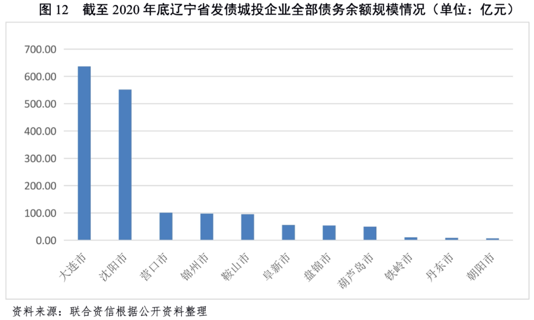 從“發債城投企業全部債務+地方政府債務”規模看,截至2020年底,大連市和沈陽市規模大,分別為2701.48億元和2329.93億元,遠高于其他地市。規模由高至低第3~5位依次為營口市、鞍山市和盤錦市,之后是錦州市規模在500億元左右,其他地市“發債城投企業全部債務+地方政府債務”規模較小,未超過500億元。