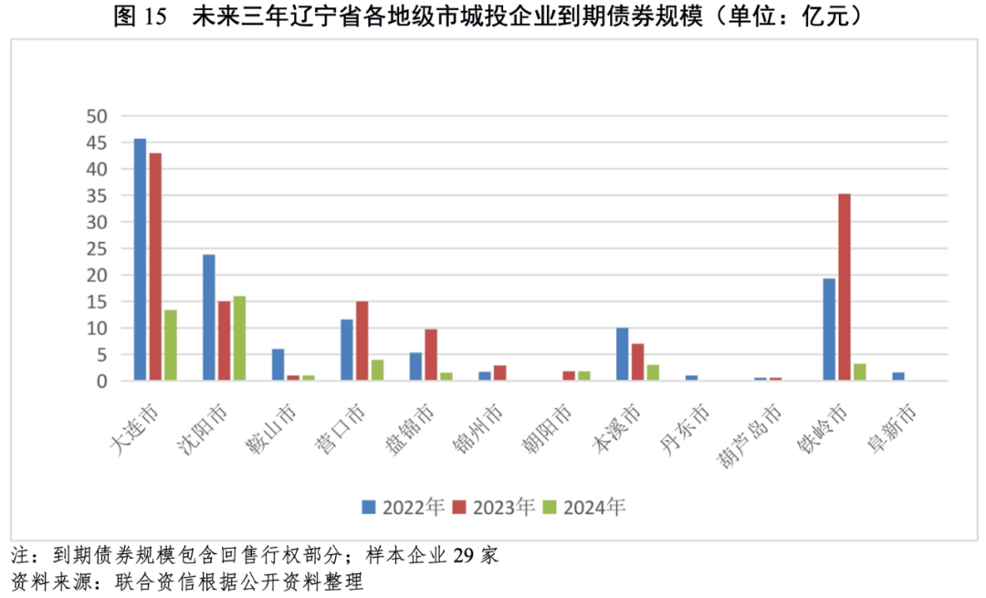 從遼寧省各地級市發債城投企業未來三年(2022-2024年)到期債券規模看,大連市、鐵嶺市和沈陽市的城投企業未來三年集中到期債券規模大,其余地市城投企業到期債券規模相對較小。