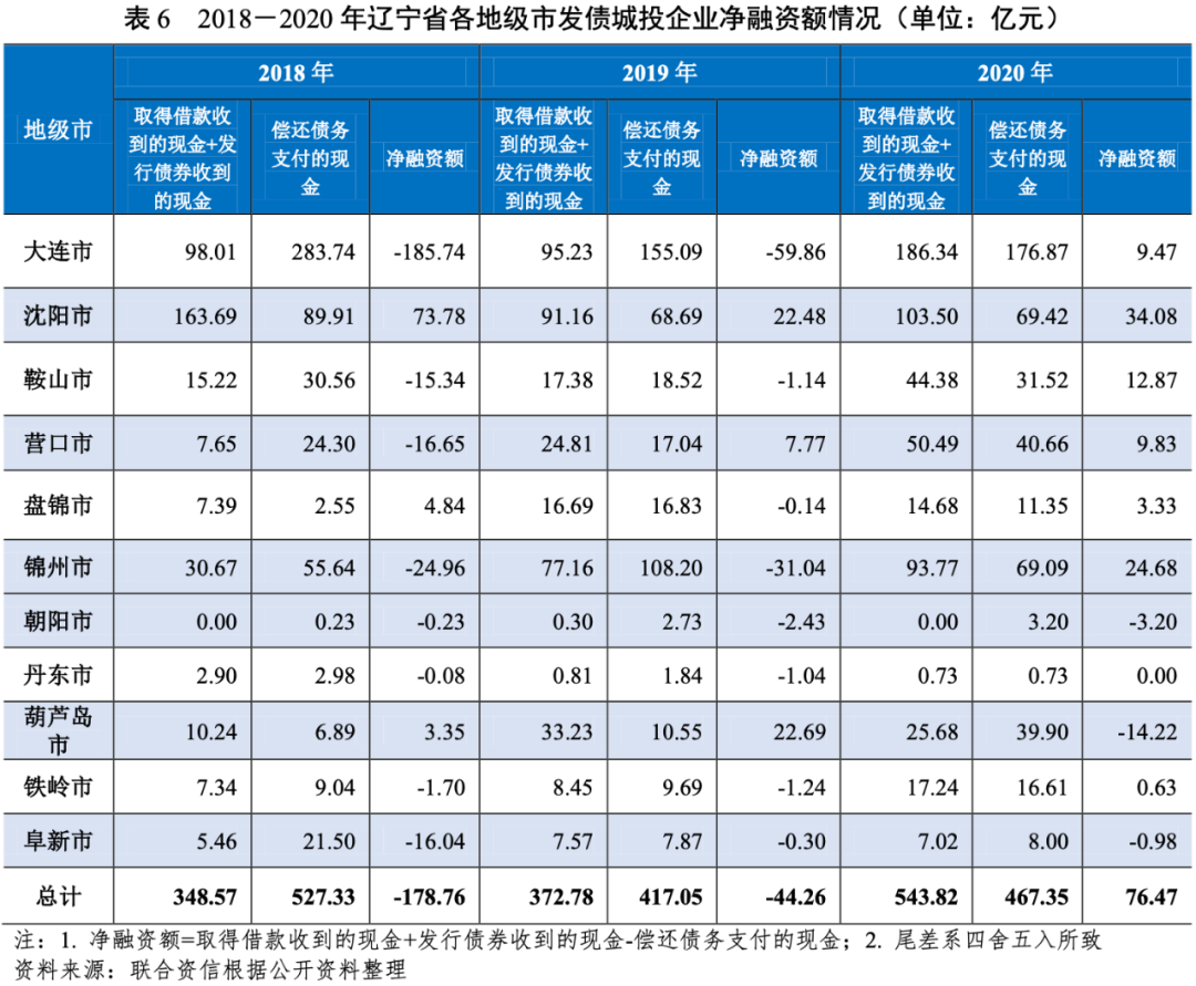 從遼寧省發債城投企業對外融資情況來看,考慮到政府注資、往來拆借等行為可能對城投企業融資活動現金流入及流出產生擾動影響,本報告利用“取得借款收到的現金+發行債券收到的現金”來表示城投企業從金融機構及債券市場進行融資形成的現金流入,利用“償還債務支付的現金”來表示城投企業償還剛性債務形成的現金流出,更為直觀地體現了城投企業自身融資能力以及金融機構及債券市場對城投企業的認可度。2018-2020年,遼寧省發債城投企業“取得借款收到的現金+發行債券收到的現金”呈現快速增長的態勢,年均復合增長24.91%。具體來看,大連市發債城投企業“取得借款收到的現金+發行債券收到的現金”波動增長,且2020年融資規模同比增幅較大,2020年大連市、沈陽市和錦州市發債城投企業“取得借款收到的現金+發行債券收到的現金”金額占遼寧省發債城投企業“取得借款收到的現金+發行債券收到的現金”總額的87.38%;錦州市、營口市和鞍山市發債城投企業“取得借款收到的現金+發行債券收到的現金”持續增長,且2020年融資規模同比增幅較大,主要系為應對當年到期的高額債務加大了融資力度所致;同期,沈陽市、葫蘆島市和盤錦市發債城投企業“取得借款收到的現金+發行債券收到的現金”均有所波動,其中,葫蘆島市波動下降趨勢明顯,凈融資額亦由正轉負。2018-2020年,遼寧省發債城投企業“償還債務支付的現金”波動下降,年均復合下降5.86%。具體來看,大連市和沈陽市城投企業“償還債務支付的現金”均波動下降,其中,2019年均出現較大幅度下降,2020年大連市和沈陽市城投企業支付的現金規模占遼寧省發債城投企業“償還債務支付的現金”總額的52.70%,大連市發債城投企業的凈融資額由負轉正,沈陽市發債城投企業的凈融資額持續為正;錦州市、營口市和鞍山市發債城投企業“償還債務支付的現金”波動增長,凈融資額亦呈波動態勢;葫蘆島市發債城投企業“償還債務支付的現金”呈持續增長態勢,與其“取得借款收到的現金+發行債券收到的現金”變動趨勢相反,導致其凈融資額由正轉負,資金缺口有所擴大。總體來看,除葫蘆島市、朝陽市和阜新市外,2020年遼寧省發債城投企業凈融資額均呈凈流入,融資環境有所改善。