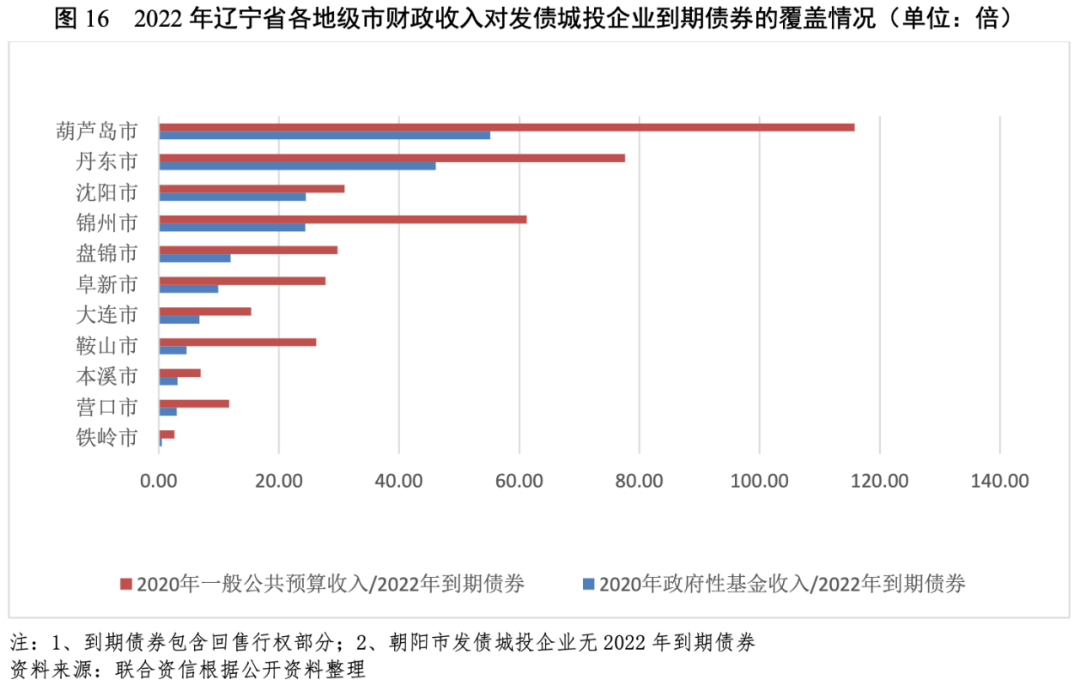 從一般公共預算收入或政府性基金收入對發債城投企業2022年到期債券的覆蓋情況來看,鐵嶺市政府性基金收入對到期債券的覆蓋程度較低,其余地市一般公共預算收入或政府性基金收入對到期債券的覆蓋程度均較高。