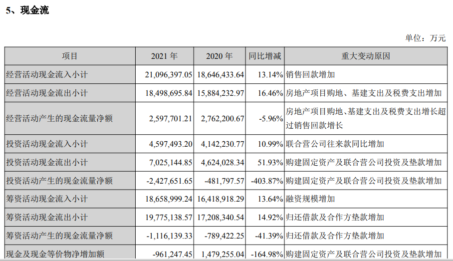 同時(shí),投資活動產(chǎn)生的現(xiàn)金流量凈額為-242.77億元,2020年為-48.18億元,下滑403.87%年,年報(bào)解釋說購建固定資產(chǎn)及聯(lián)合營公司投資及墊款增加。