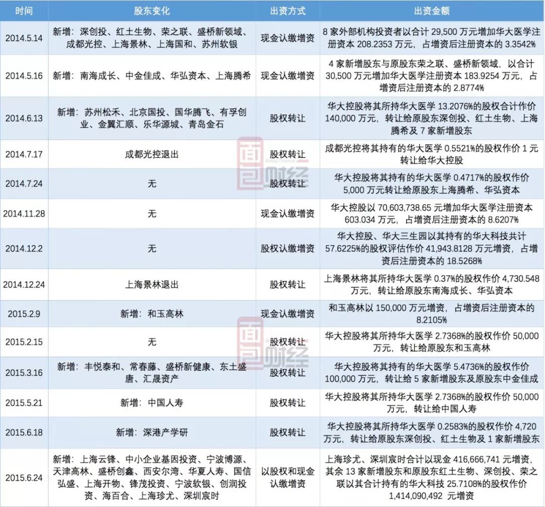 華大基因的前身為2010年成立的華大醫學,成立之初其股東為華大控股(95%)和華大三生園(5%)。2014年3月,華大三生園將5%的股權轉讓給華大控股,2014年5月,華大控股又將公司32%的股份以4480萬元的價格轉讓給華大投資。這之后,公司經歷了一段“搶購式增資”時期。粗略列表: