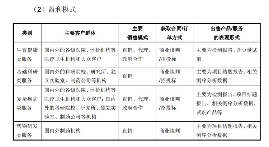 華大基因業務主要分為生育健康基礎研究和臨床應用服務、基礎科學研究服務、復雜疾病基礎研究和臨床應用服務及藥物基礎研究和臨床應用服務四個板塊。在招股說明書中,這四個板塊的盈利模式如下圖: