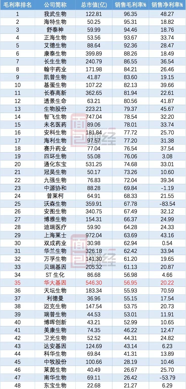 2017年,華大基因毛利潤率在48家公司中排名第35位,凈利潤率排名28位。處于中等偏下位置。