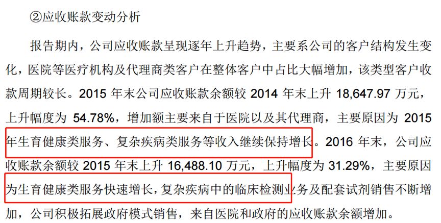 近年來,華大基因增長最快的業務為生育健康業務。自2013年至2017年,公司生育健康板塊的收入從3.27億增至11.36億,累計增幅247.40%,其在營收中的占比也由11.48%上升至54.21%,生育健康業務已成為拉動公司營收增長的主動力,也成為公司應收賬款的主要來源。公司在招股說明書中表示:
