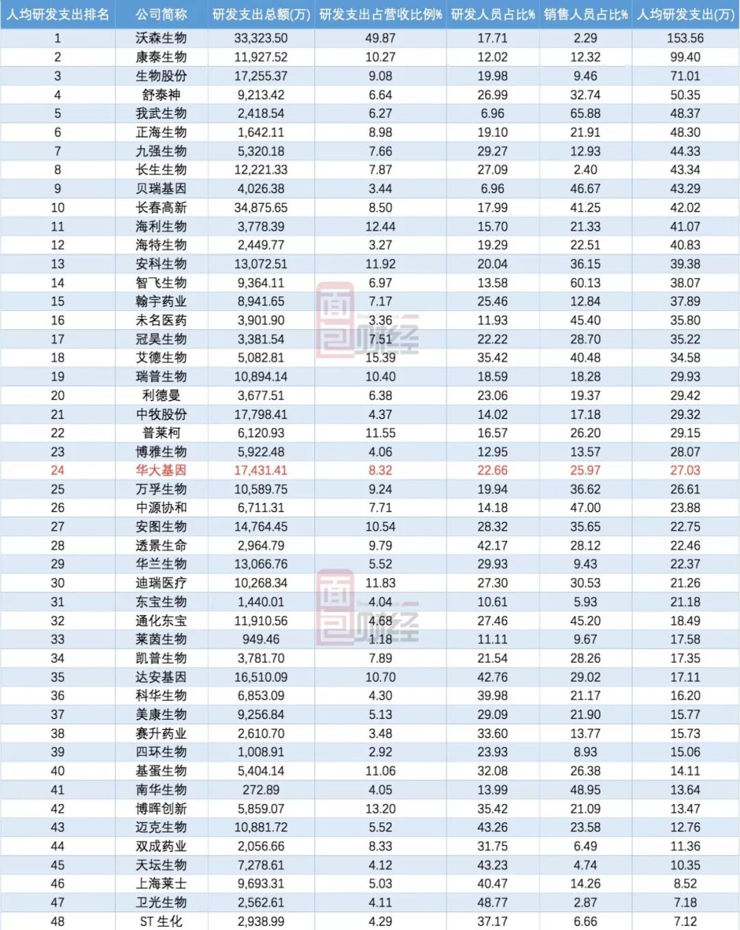 但是,從行業對比來看,華大基因研發支出在營收中的占比和人均研發支出排名并沒有居于行業最前列,只是處于行業中游水平。