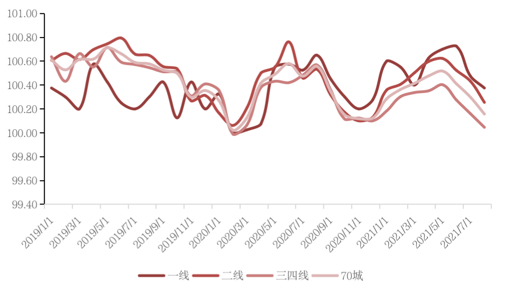 2019年1月以來70城及各能級城市新建商品住宅價格指數(shù)環(huán)比走勢