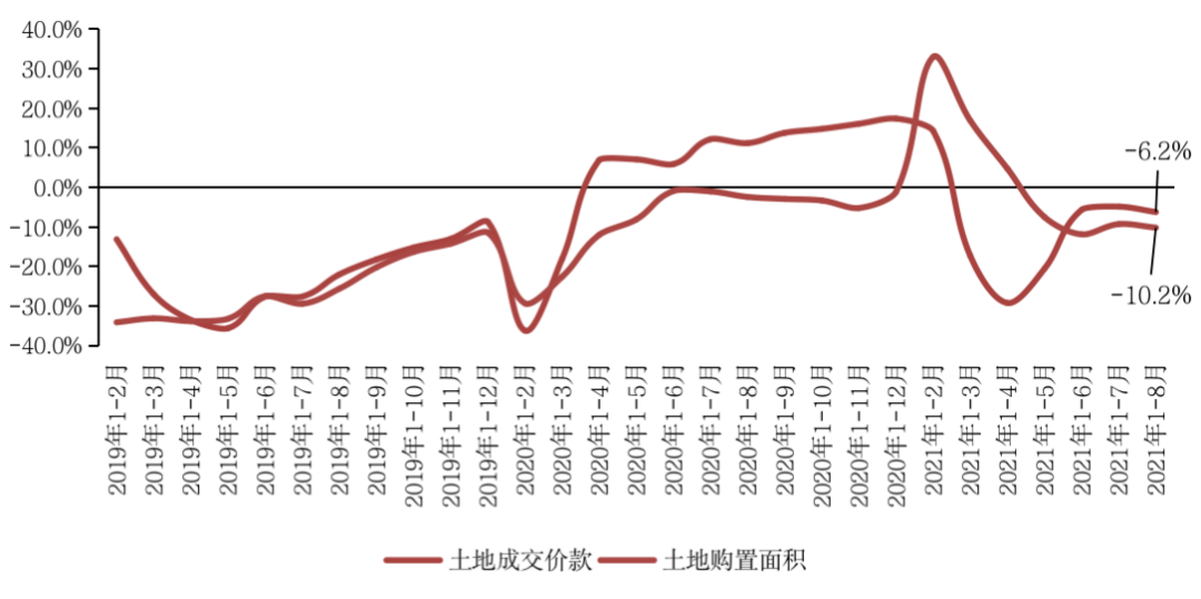 1-8月,房地產(chǎn)開發(fā)企業(yè)土地購置面積10733萬平方米,同比下降10.2%;土地成交價款6647億元,下降6.2%;二者較1-7月降幅分別擴大0.9和1.4個百分點。8月受到多城二輪集中供地規(guī)則調(diào)整,一二線城市土拍量價均延續(xù)低位運行。同時受土地側(cè)調(diào)控進一步深入影響,熱點三四線城市8月土拍降溫明顯,如嘉興最近一輪土拍過半數(shù)地塊未達熔斷階段即成交,3宗宅地更是底價成交。