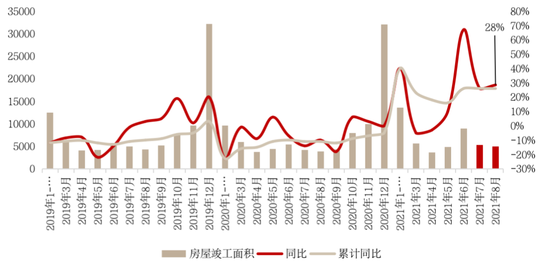 8月全國房企房屋竣工面積4957萬平方米,同比增速和累計同比增速雙雙增長至26%和28%。一方面“交付大年”下房企具備剛性壓力,另一方面提速已售項目竣工可盤活預售資金監(jiān)管賬戶內(nèi)資金。因此房屋竣工面積持續(xù)發(fā)力,支撐8月整體投資規(guī)模環(huán)比小增。