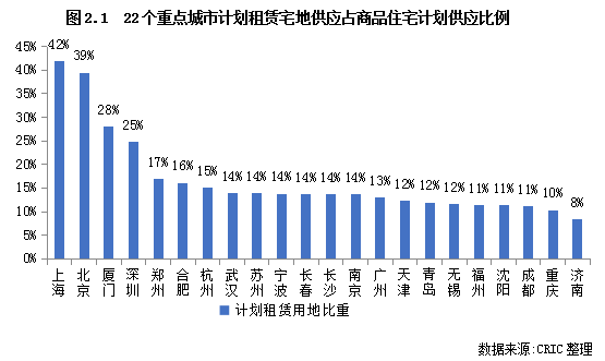 通過(guò)對(duì)22個(gè)重點(diǎn)城市2021年供地計(jì)劃中商品住宅及租賃住宅用地的規(guī)模進(jìn)行梳理和測(cè)算,結(jié)果發(fā)現(xiàn):除濟(jì)南外,其余21個(gè)城市租賃房供地計(jì)劃占比均高于10%,尤其是北京和上海兩個(gè)一線城市,租賃宅地占商品住宅用地的比重均在四成左右;其次是廈門、深圳、合肥、杭州等城市,比重均超15%;余下的重點(diǎn)城市中,除濟(jì)南相對(duì)較低之外,其余城市租賃宅地計(jì)劃供應(yīng)量均按照中央10%的“紅線”設(shè)置,約在10%左右。