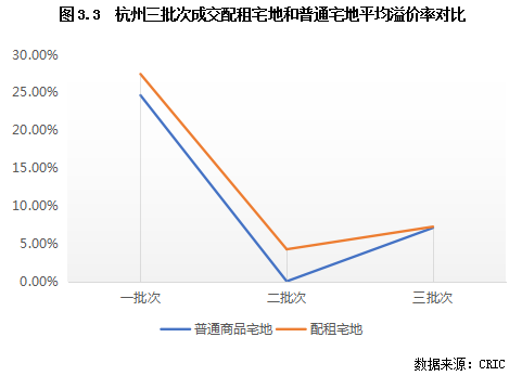 從上節(jié)可以看出,配租宅地往往位于中心城區(qū)及郊區(qū)的熱點(diǎn)片區(qū),而普通商品住宅用地則大多位于臨安等遠(yuǎn)郊片區(qū)或?yàn)橥恋匦再|(zhì)較為復(fù)雜的宅地,房企拿地意愿不高。因此,從成交溢價(jià)率來(lái)看,配租宅地的平均成交溢價(jià)率往往也高于普通商品住宅地塊,即使在熱度明顯下降的第二批亦是如此。