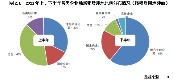 而進(jìn)入下半年以后,民企投資態(tài)度發(fā)生大幅轉(zhuǎn)變,不再積極拿地,即使拿地也不再積極競(jìng)拍至需要競(jìng)配建的輪次,因此新增租賃用地建面大幅下降,占比下滑至10%;反之國(guó)企央企、地方平臺(tái)公司新增租賃用地的比例大幅提升,國(guó)企央企提升至22%,地方平臺(tái)公司更是提升至61%,成為各地新建租賃用房的主力。