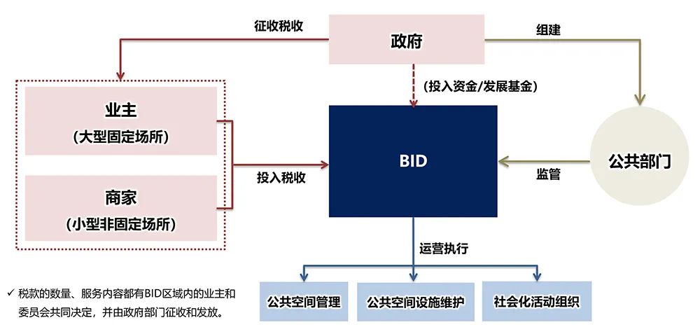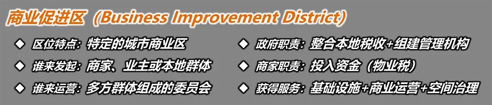 英國BID模式(Business Improvement District),即建立商業促進區。主要針對發展成熟的街區進行商業化提升,從而調和「寸土寸金」所導致的公、私雙方的利益沖突。