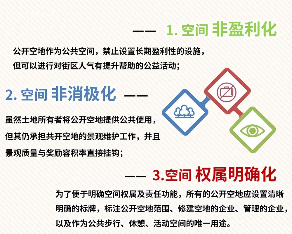 「公開空地」是指大型開發項目內的公共開放空間,這些空間必須具備空間非盈利化、空間非消極化、空間權屬明確化的三大特點。