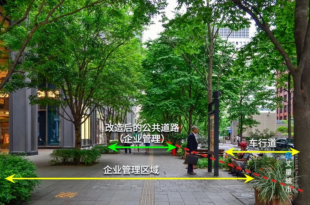 如在丸之內仲大街的步行道加寬改造中,被壓縮的車行道所有權屬于千代田區,被加寬后的步行空間劃撥給企業管理使用。