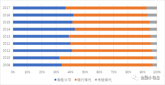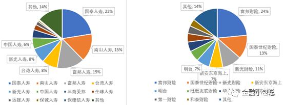 截止2018年底,臺灣地區一共有55家保險公司,其中再保險公司3家、壽險公司29家、財險公司23家。從保費收入來看國泰人壽、新光人壽、富邦人壽、南山人壽、臺灣地區人壽這前五大壽險公司占據了70%的市場份額,其中有4家為金控集團旗下壽險品牌,而市占率不到百分之一的壽險有9家。財險方面,富邦、國泰世紀和新光三家金控集團下的財險公司占據了整個市場的46.98%。