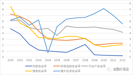 70年代到90年代是臺灣地區經濟高速增長和經濟轉型的時期,經濟增速較快,因而房地產相對收益率較高,但是90年代初股災和房地產泡沫破滅后,臺灣地區房地產進入了有價無市的陰跌狀態。到2010年后,臺北市的寫字樓收益率也跌到只剩下2%。以國泰人壽為例,不動產投資的收益率從2000年的6.14%下降到2012年的4.16%。
