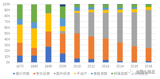 上世紀90年代之后,隨著臺灣地區經濟從中高速步入低速經濟增長,本土制造業受累于成本高企而大量外遷,臺灣地區本土的各類資產投資收益率逐年走低(參見圖十四:國泰人壽各類資產資金運用的收益率走勢),保險業者紛紛要求主管部門放開境外投資的上限,境外投資占臺灣地區保險業投資的比重逐年上升。
