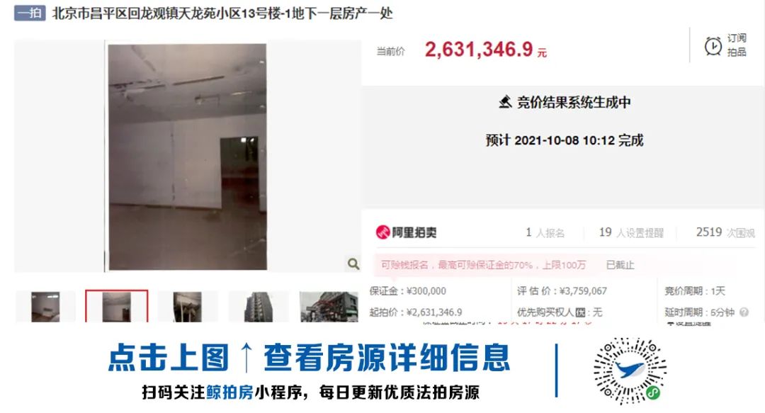 昌平回龍觀的一處地下室,經歷了一輪拍出、悔拍、再次上拍、再次拍出,今日又以起拍價格263萬成交,與上次拍成價格相同。