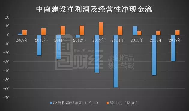 公開數據顯示:自2010年以來,除2015年以外,公司經營活動產生的凈現金流持續為負。八年七負。2010-2017年,中南建設凈利潤合計約71.65億元,經營性現金凈流出約216.77億元。期間公司業務占比發生了變更,從2010年開始統計,或許忽略了業務變化對經營的影響。那么,從2015年算起,3個完整的財務年度,也有2年經營性凈現金流為負。